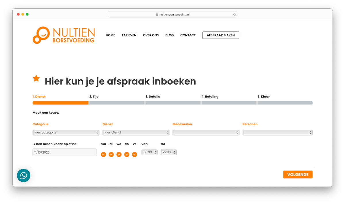 Het maken van afspraken is geheel geautomatiseerd met de afsprakenmodule Bookly, dit is een premium uitbreiding voor WordPress. De klant kan zelf een dag en tijd kiezen, na betaling wordt de afspraak in Google Calender toegevoegd.